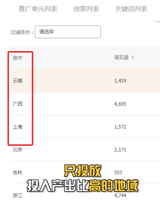 第三,地域看数据, 只投放投入产出比高的地域,比如云南13广西12上海9等等。