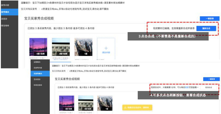 想要装修洋淘秀到主图,首先你得是邀约内测商家,且单个商品被官方收录的3条内容以上,“合成视频”按钮才会透出。