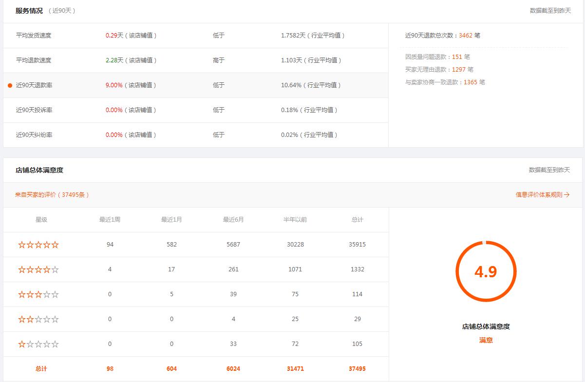 说到六项交易信用记录包括我们的累计成交数、累计买家数、重复采购率、近90天退款率、近90天投诉率、近90天纠纷率。在这六项指标下面,我们还可以参考到同比行业均值,帮助我们去分析这家店铺是高于行业水准还是低于行业水准。